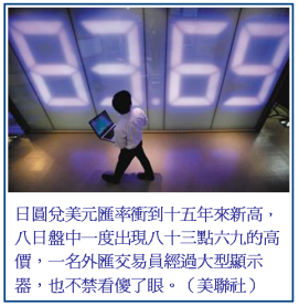 日圓升不停,昨天日圓兌美元匯率最高衝到一美元兌八十三點二日圓,創十五年新高。日圓兌新台幣匯率也創下歷史新高,昨天一台幣只能換二點六日圓;由於台灣有不少商品都向日本進口,日圓猛烈升值,將衝擊進口物價,中央銀行已密切注意日圓走勢。