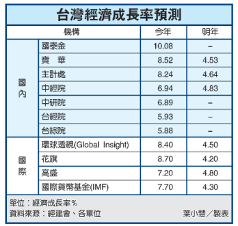 行政院主計處8月上修今年經濟成長率預估值到8.24%,明年成長率則為4.64%,寶華昨天也上修今年成長率,從6月時預估的6.82%調升到8.52%,且預測值高於主計處。