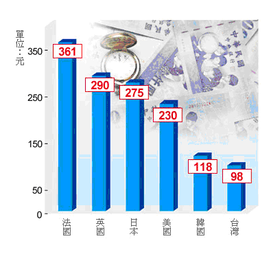 經濟之眼》台灣時薪不如人 【經濟日報╱記者林宗勳】 美國、英國、法國、日本、南韓與台灣等,今年以來都已完成基本工資時薪的檢討機制,美國決議不調整外,其他國家都微幅增加。以時薪相比,台灣基本工資的時薪調漲後僅98元,不但比不過英美法等國,也比不上日本、韓國。(林宗勳) 註:表列是換算為新台幣的約數;日本調升後時薪預定今年10月實施,韓、英、法調升後為明年實施。資料來源:勞委會。 【2010/09/15 經濟日報】
