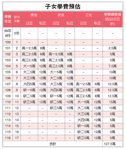 試算三個小孩要完成研究所教育的費用如下:高中三年若讀公立一年2.5萬元,若讀私立一年8萬元,大學和研究所公立一年5萬元、私立12萬。以公立學校估計,暫不考慮學費調漲的因素,三個孩子總共需要127.5萬元,這對麗珠真是天文數字。