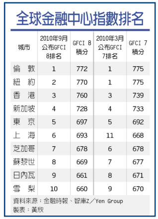 英國金融時報公布最新「全球金融中心指數(Global Financial Centres Index, GFCI)」,上海的排名半年內大幅躍升5名來到第6名,首度晉升到前10名;前10名中,共有4個亞洲城市位居榜內,顯示亞洲金融中心不但愈加成熟,在國際市場上也更顯份量。