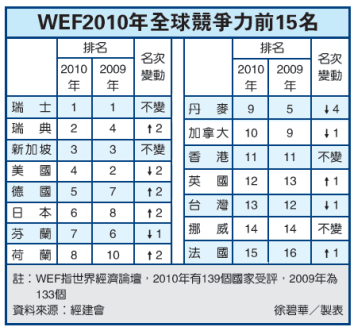 世界經濟論壇(WEF)(9)日發布2010年全球競爭力排名,台灣今年被英國超越,排名後退一名,由第12落到第13名。經建會主委劉憶如說:「從分數看,台灣是進步的,英國比我們進步更多。」
