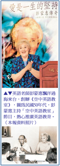 現年八十四歲的彭蒙惠,廿五歲到台灣傳教,民國五十一年創辦《空中英語教室》,過去近半世紀經由廣播、電視、網路教英語,影響無以數計的青年學生,連前行政院長郝柏村、前警政署長顏世錫等人,都是聽她的廣播節目學英語。