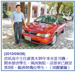 除了傳道、授業、解惑,還有老師不辭辛勞,開車接送學生上下學。虎尾高中圖書館主任康萬木的專車,一開就是二十年,載過三十幾個學生,完全不收油料補貼,唯一原則是「車上不准打瞌睡」。康萬木說:「學生上車得把握時間,背國文或英文單字,單趟二十分鐘,來回四十分鐘,一星期就比別人多四小時,一學期就八十小時。」