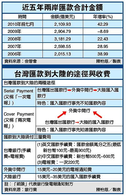 第一銀行國際業務事業群國際處經理塗岐元表示,兩岸匯兌洶湧,企業部分以三角貿易再匯出款最多;個人部分則接濟或捐贈對岸親友的膳家匯款居多。