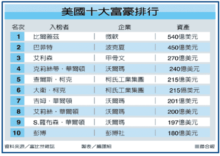 富比世雜誌公布「2010年美國400大富豪排行榜」,微軟創辦人蓋茲以540億美元(約台幣1.7兆元)連續17年居冠。股神巴菲特資產450億美元,蟬聯第二名。