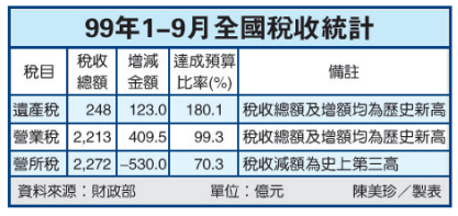 景氣回春、消費增加,加上前台塑集團創辦人王永慶百億遺產稅已經入庫,99年全國賦稅收入至9月底為止,以營業稅與遺產稅的表現最佳。全國遺產稅收總額已突破248億元,年度未結束就已超徵110億元。