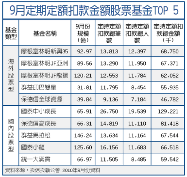 最新國人最愛的定期定額基金出爐!據投信投顧公會統計,國泰中小成長基金9月定期定額扣款總金額已破億元!而在海外基金的部份,則有3檔基金包括摩根富林明新興35、摩根富林明JF亞洲、摩根富林明JF龍揚基金的9月份定期定額扣款總金額逾6,200萬元!