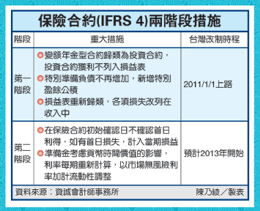 4第一階段,台灣明年將上路,保險合約定義有大幅縮限,變額年金型合約歸類為投資合約,投資合約獲利則不列入損益表,造成業者帳面收入減少。準備金部分,特別準備負債不再增加,另新增特別盈餘公積。