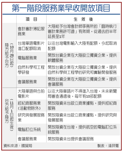 陸方已在昨日公布第一階段對我開放的5項服務業,國貿局表示,我方第一階段開放給大陸的時間訂在11月1日,至於銀行業等其餘4項則以明年元旦與貨品早收清單同步開放為目標,但如果盡早完成相關程序,不排除提前開放。