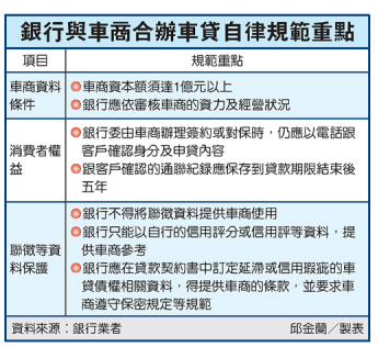 自律規範草案重點包括明訂車商的資本額必須1億元以上,銀行應依授信程序審核車商的資力及經營狀況。