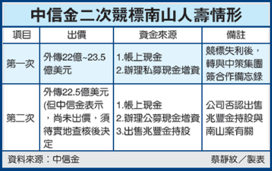 中信金第四季以來處分兆豐金動作轉趨積極,法人解讀是為了競標南山人壽籌措銀彈。法人報告中指出,中信金若順利全數出脫兆豐金持股,可籌得近250億元資金,加上辦理現金增資,可籌得逾650億元資金,有助於提高出價能力。
