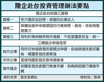 不過,發改委網站昨公布的辦法內容,明白把赴台投資的陸企,必須「有利於兩岸關係和平發展,不危害國家安全、統一」列為第4條第3項的資格要件,「化灰為明」的作法仍引發關注。