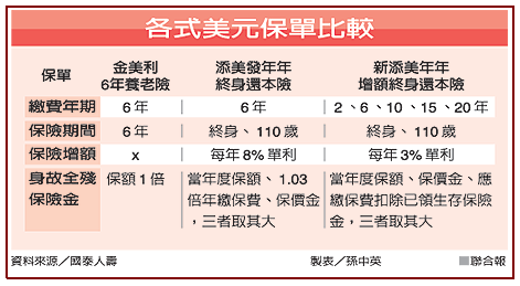 國泰、富邦、台灣人壽等業者都推出「全系列」美元保單,從養老險到還本險、增額終身險等都有,供消費者選擇。