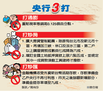 中央銀行昨天祭出連環措施「打通膨、打炒房、打炒匯」,包括升息半碼(零點一二五個百分點),第二棟房貸管制範圍擴及新北市的淡水、林口、三峽;還破天荒大幅調升外資新台幣活期存款準備率,增加外資匯入的成本。