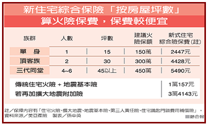 產險業者新開發出住宅綜合保險,按房屋坪數大小及實際理賠經驗計算火險保費,不管是單身貴族住的套房、頂客族的小公寓或三代同堂大房屋,火險保費加計地震險保費,都比傳統保單便宜一半。