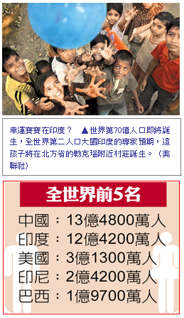 聯合國估計,世界人口將在卅一日突破七十億大關。聯合國秘書長潘基文對全球誕生第七十億個寶寶並不感到興奮,表示在這個貧富兩極的「矛盾世界」,第七十億人若出生在貧窮線以下的家庭,人生的艱苦戰才剛開始。