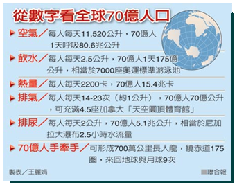 聯合國祕書長潘基文日前表示,人口跨過七十億的重點非關數字,而是與人類生存狀況休戚相關:「七十億人口需要足夠的糧食和能源,良好的教育和就業機會,以及平安順利把子女撫養長大的自由。一個人想擁有的東西,都得乘上七十億倍。」