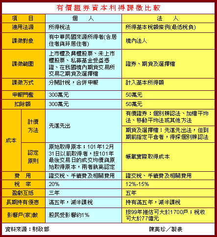 至於法人部分,證所稅仍維持在最低稅負制內處理,課稅門檻與扣除額,自現行200萬元降至50萬元;企業的最低稅負所得稅率級距,則自10%至12%,上調為12%到15%。財政部建議適用的稅率為12%。
