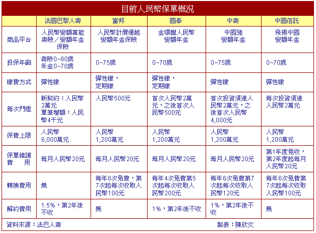 人民幣保單近期火紅上路,各大保險公司紛紛推出相關保單搶市,外商壽險公司也不缺席,更以保單的差異性來搶攻市場。