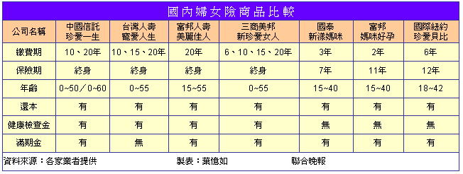 有不少壽險業者均針對女性推出「婦女險」,與一般壽險、健康險不同之處,在於保障範圍涵蓋女性特有或常見的疾病,像是紅斑性狼瘡、乳房重建手術、懷孕期間特定併發症、特定婦科手術、類風濕性關節炎等,甚至包含生育保險金及嬰兒先天殘缺的後續醫療費用,等於一張保單既有壽險保障、女性重大疾病醫療保障,還可保障到自己的小孩。至於特定癌症保險金只有中國信託人壽的保單有理賠。
