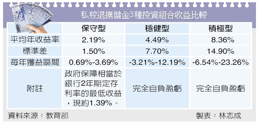 教育部私校退撫儲金監理會執行祕書賴俊男呼籲,長期來看,「穩健型」及「積極型」的投資組合獲利較高,年輕的私校老師可以往這個方向移動,為自己存多一點退休金,以後日子會更好過。