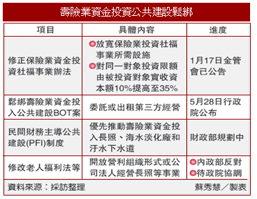 行政院去年推出的「推升經濟動能方案」工作重點之一是促進壽險業資金投入公共建設,包括鬆綁投資BOT案;鬆綁投資醫療、長照、養老、終老事業所需設施;檢討公共建設相關法令,開放以營利組織形式與公司法人,經營老人長期照護等社會福利機構等。