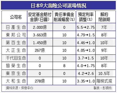 其中,日本8家壽險公司退場,如日產生命、東邦公司、東京生命到大和生命等,有些責任準備金削減8∼10%,保單預定利率則從平均3.35∼5.5%,調降到1∼2.75%;同時也祭出7∼10年不等的「保單閉鎖期」規定。