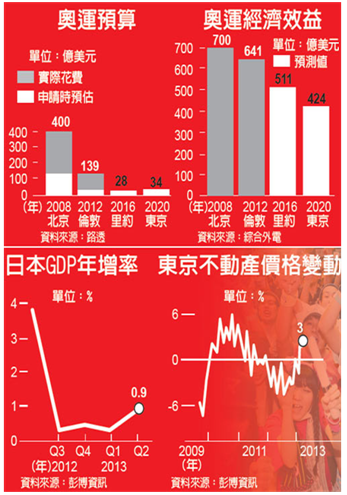 日本首相安倍晉三在東京「申奧」成功後,激動發表電視談話,「盼東京辦奧運成為終結通貨緊縮的起爆劑,為日本的經濟與成長帶來『和風』」。值此日本國民信心翻轉向上、東京股市扶搖直上、民眾樂觀呼聲甚囂塵上之際,再加上奧運這「第四支箭」,對日本經濟、股市與安倍內閣無疑是錦上添花。