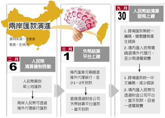 銀行局表示,今年外幣匯款三大里程碑,分別是2月6日人民幣清算機制啟動,先前兩岸人民幣不得直接通匯,但在清算機制之後,即透過中國銀行台北分行直接匯往大陸中行,再轉匯大陸其他受款銀行。
