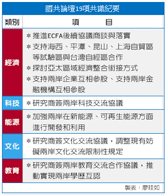 本屆國共論壇達成的19項共同建議,第一項便是繼續推進ECFA後續商談。此外,鼓勵台灣自由經濟示範區與大陸海西、平潭、昆山與上海等試驗區進行廣泛合作。此外,在區域經濟整合方面,與會者認為應該共同合作應對國際情勢帶來的挑戰與機遇,為如何加入創造條件。