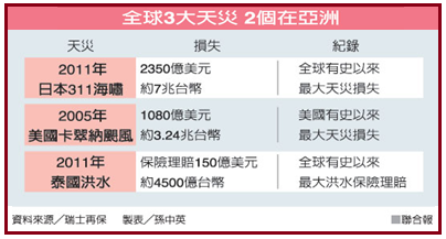 瑞士再保針對天災對全球城市威脅排名調查發現,面臨天災,全球最危險的都會區都集中在亞洲,尤其是東亞的「日本、大陸、台灣和菲律賓」;因為這些國家,人口傾向擠在幾大都會區,遭逢天災打擊後影響的人口數目和經濟受創風險,也相對集中。