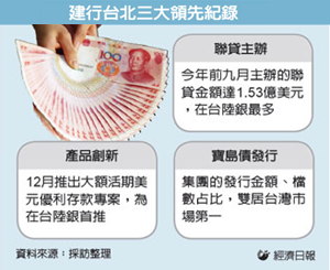 再者,台灣的人民幣存款量已達3,005億元,全球僅次香港,但人民幣產品還是不多。台北分行要利用母行的人民幣第二大行優勢,提供更多人民幣跨境服務。