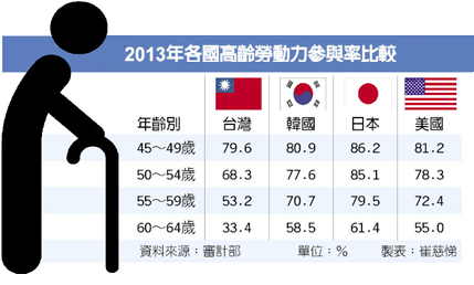 68.27%、55至59歲為53.21%,60至64歲則降至33.42%,與韓、日、美等國家相較,我國中高齡各年齡層的勞參率遠遠落後。