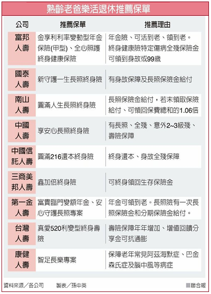 父親節剛過,45到50歲左右的熟齡老爸,正處於退休準備階段。因應退休生活,熟齡爸爸們該買什麼保險。主力壽險公司推薦利率變動型年金、還本壽險,若行有餘力,也可先備妥一張長期照顧險保單。