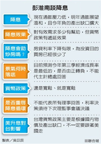 彭淮南認為,全球景氣復甦緩慢且具不確定性,國內經濟成長減緩、負的產出缺口擴大,通膨預期溫和,加上實質利率相對仍高等因素,央行理事會一致決議調降貼放利率。