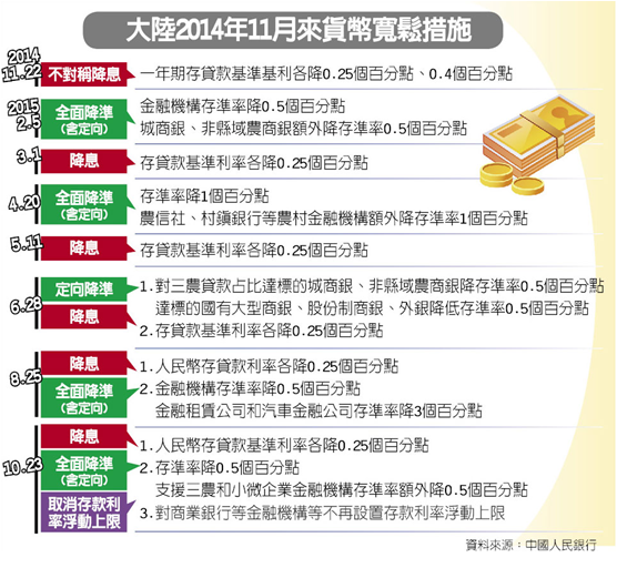 從6月以來,半年不到,大陸已3度雙降;除了GDP成長未達理想外,製造業的低迷、投資增速的放慢、資金外流等因素,都讓中國央行面臨了必須持續擴大刺激貸款的壓力。