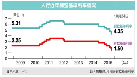 中國人行自去年十一月以來至昨日,已是第六度降息,不到一年時間,累計調降貸款基準利率一點六五個百分點、存款基準利率一點五個百分點。