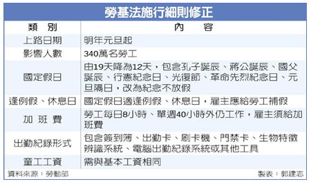 本次細則修正後規定,國定假日適逢例假、休息日,雇主應給予勞工補假;當明年元旦後,法定正常工時降為單周40小時,雇主若讓勞工於每日8小時、單周40小時之外的時間繼續出勤工作,就屬於延長工作時間,須給加班費。勞動部說,否則可開罰30萬元。