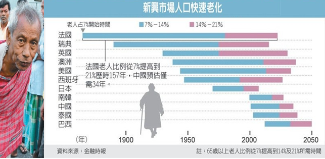 新興市場人口老化速度將比已開發國家更快!據美銀美林預估,到2050年新興市場60歲以上的老年人口將占全球老人的80%,而退休年金及健保支出激增將使各國政府的財政備受壓力。