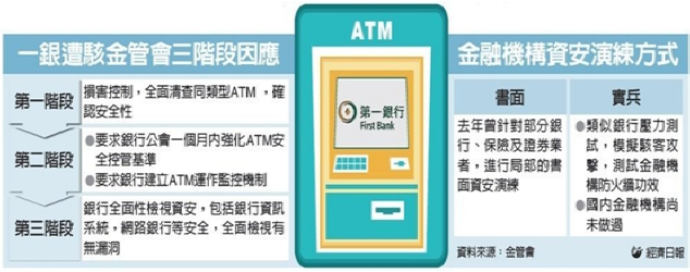 一銀爆發ATM被盜領案後,各界更加關注,數位金數發展趨勢下銀行的資安問題,金管會官員昨(17)日表示,這次事件後,金管會已採三階段因應措施。第一,損害控制,全面清查同類型ATM有無問題;第二,要銀行公會一個月內強化ATM安全控管基準。