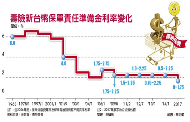 台灣壽險市場發展逾半世紀,明年將出現壽險史上最貴保費。根據金管會訂定的公式計算,明年長年期新台幣保單責任準備金利率將正式跌破2%,降為1.75%,繳費逾6年的終身壽險保費將比今年貴10∼20%、比20年前更貴1∼2倍,躉繳6年期儲蓄險責準利率則可能降為0%。