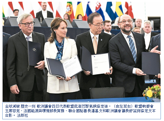 歐洲議會四日代表歐盟廿八國批准巴黎氣候協定,使這項劃時代協定跨越門檻即將生效。