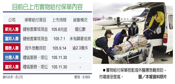 實物給付保單開賣滿5個月,大部分叫好不叫座,目前銷路最佳的是國泰人壽推出的海外醫療專機附加條款,9月14日開賣到11月底,已有逾2.3萬件,且已有保戶真的從日本坐醫療專機,後送回台灣接受治療,相關運輸費用皆由國壽給付。