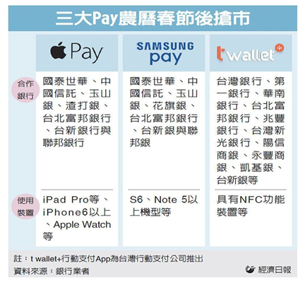Pay也傳出在第一季啟用,同樣與7家銀行合作,加上台灣本土台灣行動支付公司推出的「台灣Pay」,三雄鼎立時代來臨。