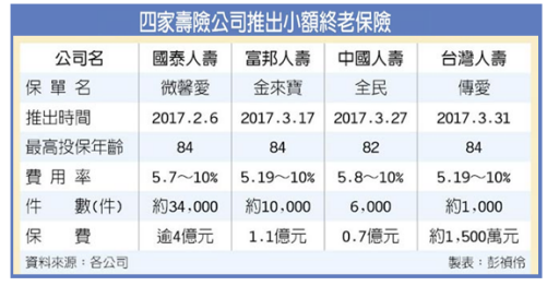 國泰人壽是市場上第一家推出小額終老保單者,到本月25日已銷售逾3.4萬張,保費逾4億元,是目前該款保單第一名;富邦人壽則急起直追,率先給予保費轉帳折扣1%,3月中開賣至今,也已有1萬件,保費1.1億元,排名市場第二大。