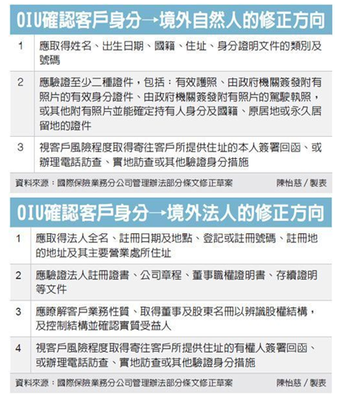上述規定下,OIU的境外客戶須提供第二證件給保險公司,而且,保險公司須按客戶風險等級,取得客戶簽署的回函,或辦理電話查訪、實地查訪或其他驗證身分措施,保險公司可委託中介機構或專業人士執行。