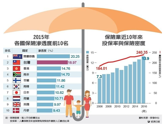 近年台灣經濟情況不佳,保險滲透度還是居高不下。壽險業者解釋,這是因為台灣保費收入逐年增長,尤其是壽險業每年新契約保費進帳相當可觀,去年高達1.2兆元,但國內經濟成長較為緩慢,使得保險滲透度、貢獻愈來愈高。
