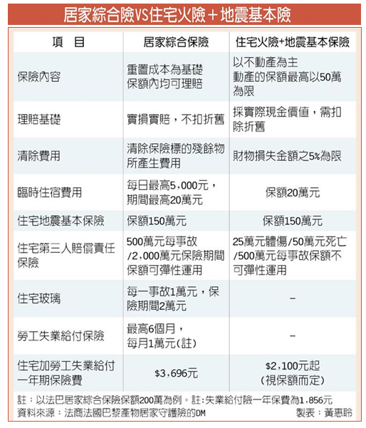 法巴產的居家綜合險,除了「勞工失業給付保險」之外,也有一般產險居家綜合險的「住宅火災及地震保險」,承保建築物因火災或地震而需重置成本,與臨時住宿費用,「住宅火災保險」還包含清除費用、竊盜理賠以及承保建築物內動產。