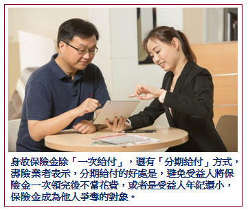 身故保險金除「一次給付」,還有「分期給付」方式,壽險業者表示,分期給付的好處是,避免受益人將保險金一次領完後不當花費,或者是受益人年紀還小,保險金成為他人爭奪的對象。